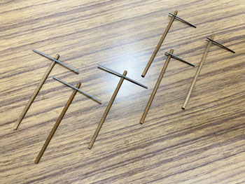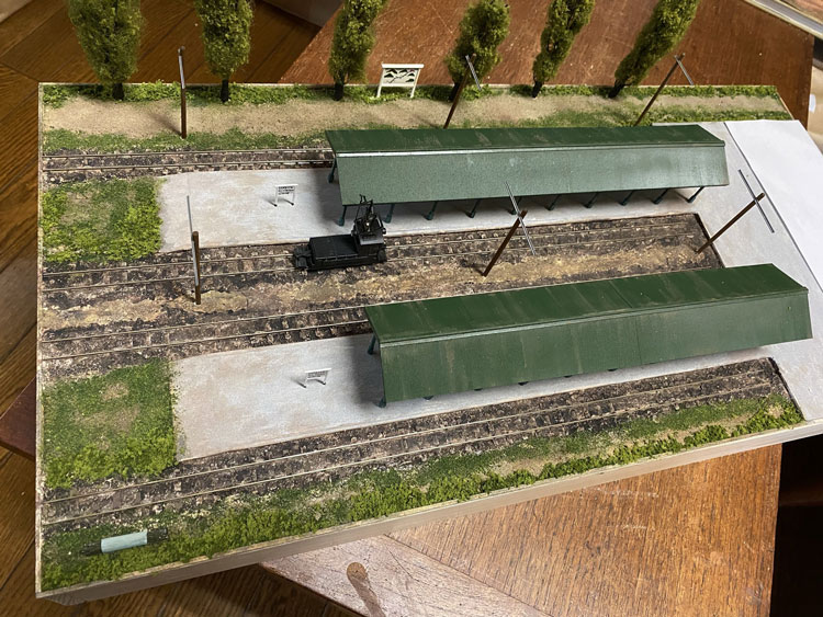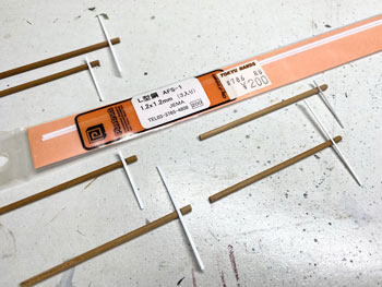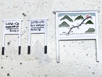 ![]() 架線柱はφ3の木の丸棒と1.2mm角のプラ製アングル材。このアングル材も大分前に買っておいたもので、ようやく日の目を見ました(^O^)。 丸棒には少しカッターで凹みを作ってアングル材を接着。 軽くフラットブラックの溶液で汚して、アングル材はグレーに塗ってウェザリングマスターで少し錆びさせました。 ![]() 駅名標はエコーモデル製のものにφ0.2のロットリングで書きましたが、ボクには「しんかるいざわ SHIN-KARUIZAWA」と読めます(^O^)。 観光地の入口らしく路線案内看板も欲しかったので、本来は駅舎の入口に掲げられているデザインを模して作ってみました。 これもまたチャンと駅名はボクには読めます(^_-)。 ![]() 架線柱や駅名標が付いて大分それっぽくなってきました(*^^)v。 ![]() これは先日、地面に石膏を溶いたものを塗るときに作ったものの残りです。 チョット勘違いをして、いささか多く作り過ぎてしまいましたが、こんなに多くはなくてもどうしても残りは出来てしまうもの。 この容器はもう何十年か前に買ったものですが、専ら石膏を溶かすときに使っています。 ゴムで出来ているので、ホニャホニャしてます(^^♪。 ですから残った石膏もこのように取り出す事が出来て、そのままゴミ箱に捨てることが出来て便利です。 地面を工作される方は、おひとつ御用意されては如何でしょうか?(^O^)? |