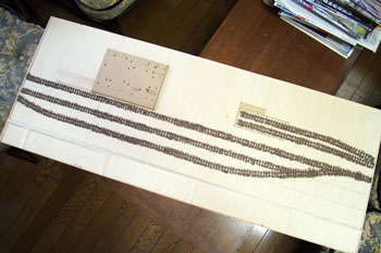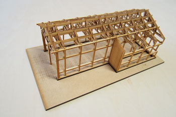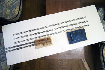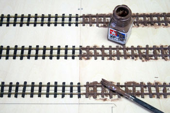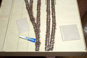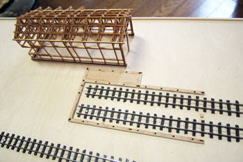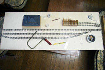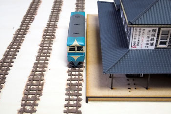 ![]() まずは台枠作りから始めます。大きさは井笠や簡易軌道と同じ1200x450mm。60x10mmの桧角材を目の字に組んで、その上に4mm厚ベニヤを貼ります。 ベニヤは前回の残りで賄えそうだったので、写真のような形にはなっていますが・・・。 写真の日付を見ると6月15日になっていますね。台枠の製作が実質的なレイアウト製作のスタートだとすると、完成したのは7月7日でしたので、3週間で完成まで漕ぎ着けたことになり、我ながら突貫工事でよくやったものだわい、と思います(^O^)。 ![]() レール間の寸法は50mm(機関庫の部分は30mm)としてフレキシブルレールを置いてみたところ。 因みに井笠は45mmにして町線らしさを演出して、逆に簡易軌道は55mmにして北海道らしさを出しました。 今回はポプラ並木と田圃をぜひ作りたかったので、そのスペースも考えると3本敷ける幅だということが判りました。 そしてポイントを2個配置して釘で固定です。 実はこのイメージ図はこの段階で描いたものだったりします(^-^;;。 ![]() ![]() 機関庫は当社の杉沢の2線機関庫に若干の手を加えれば使えそうなので、骨組みまで出来上がったサンプルが手元にあったので工期短縮になりました(^_-)-☆。 まず、入口上の柱を切り取り、土台との間に3x5mmの桧角材を入れて5mmの嵩上げをします。また、ベース板は写真のように切り取って、ここでも高さを稼いでいます。 やはり酒井5tDLが入れば良い機関庫と、ホジ3が入る機関庫とは高さが違うモンだなあ、と実感した次第です(^_-)。 ![]() 台枠の周囲には3x3mm桧角材を接着しておき、プラスターを流し込んだ時の歯止めにしておきます。また、田圃の部分は5x3mm角材にしてあります。 フレキレールの継ぎ目には犬釘を削いでおいた枕木を差し込んでおきます。 ![]() この段階でレールと枕木とを「フラットアース」で塗っておきます。 仮に車両を置いてみて、ホームとの間隔を確認しつつ駅舎のホーム(土台部分)を接着します。 ![]() 更に車両を3両編成と仮定して、それに対応できるような長さにホームを延長してやりますが、こういった工作にはバルサ材が加工性などの点で楽で愛用しています。 ![]() ![]() 田圃のあぜ道もバルサで作っておきますが、その間隔は穀倉地帯らしく広めに設定してみました。 この間隔なども、例えば山間地の田圃などは狭くするなど変化させてやる事によって、地域性が表現できる点ではないでしょうか? 保線詰所や郵便局の土台になる部分も3mm厚のバルサを貼って確保しておき、後にプラスターを流した時に備えます。 因みに最近ではゼリー状瞬間接着剤も安い物が出てきて使いやすくなりましたので、木工ボンドで乾燥までの間に反ってしまう事も無く、作業性の効率も考えて、昔だったら木工ボンドで接着していたストラクチャーや角材・バルサ板なども、総て瞬間接着剤で工作しています。 |