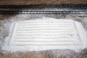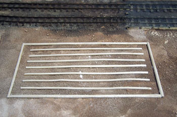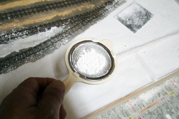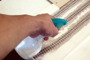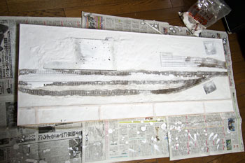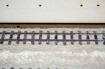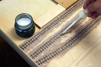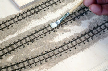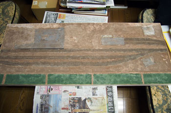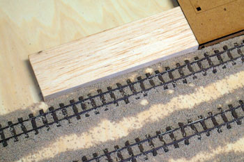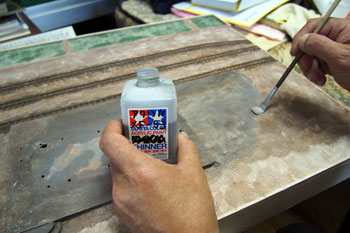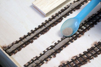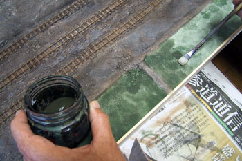 ![]() バラストはいつもと同じKATO製(つまりNゲージ用)で淡黄色細目という品です。粒の大きさはベストです(^_-)-☆。これをスプーンで撒いていきます。 そして筆で枕木の上にバラストが乗らないように掃いていきます。ただ、後で接着剤を流した時に多少はまた乗ってしまいますが、その時は仕方ないですから根気よく取り除いていきます。 ![]() 中性洗剤を僅かに垂らした水を水吹きでそっと撒きます。 その後、これまた中性洗剤を垂らした木工ボンドの水溶液(お湯で溶くと良いです)をスポイトで垂らしていきます。 いずれも中性洗剤を混ぜる理由は、界面活性剤の効果で浸透が良くなるからです。 ![]() ![]() 上の写真が接着し終えたところですが、御覧のとおりバラストが枕木の上やレール側面に着いてしまっていますので、乾燥したらマイナスドライバーなどで取り除いていきます。 そうするとどうしても塗装が剥げてしまいますので、タッチアップしておきます。 ![]() バラストの乾燥時間を使って他の作業も並行してやります。 田圃のあぜ道や目止めの角材部には木工ボンドを流しておき、「水」を流し込んだ時に不用意に流れ出さないようにしておきます。 また、Nゲージ用の石垣板も部分的に活用してみるのも良いでしょう。 ![]() バラスト撒き以上に神経を使うのがプラスター撒きではないでしょうか?しかし、これも慣れてしまえば特に難しい訳でもなく、チャレンジしてみる価値はあると思います。 最近では石膏ではなく、各種のプラスターも販売されているようですが、ボクはいつもホームセンターで買う吉野石膏の石膏を水で溶いて使っています。溶く容器は40年来愛用しているゴム製のもので、使用後の水洗も楽です。 プラスターを流し込んだら、半乾きの状態の時に茶こしを使って石膏を撒いていきます。これをする事によって「粗な感じの土」になり、逆にこれをしないと「奇妙にツルツルした地面」になってしまいます。 ![]() これがプラスター作業が終わったところです。ホームの端などある程度のボリュームが欲しい部分は、ティシューを千切ったものを石膏に浸したものを使います。 どうしても線路の部分にもプラスターは流れてしまいますので、乾燥後に歯ブラシなどで取り除いていきます。 そして一回目の着色。これはシンナーで極く薄く溶いた「フラットアース」を使います。 ![]() ![]() 田圃の底も着色しておきます。 ここまできて、機関庫の脇の空き地に畑が欲しくなったので、バルサで盛り土を作ってやり、もう一度プラスター作業をしました(^-^;;。 そして二回目の着色。シンナーで極く薄く溶いたアクリルの「フラットブラック」を使ってニュアンスを付けていきます。 ![]() これが二回目の着色を終えた状態。上の写真と比べると大分「らしく」なってきましたネ(^v^)。 土の色というのは地方によっても違うし(関東ローム層を見て育った方々は茶色っぽく、シラス台地を見て育った九州の方々は白っぽく)、耕されている土と、道路などの土とも色が違います。 ですから「これが一番」という事はないのですが、こういった部分に個性が出るのではないでしょうか? そして三回目の着色。今度はシンナーで極く薄く溶いたエナメルの「フラットブラック」を使って更にニュアンスを付けていきます。 ![]() 上の写真と比べると更にニュアンスに富んだ地面になっている事がお判りだと思います。 同様に田圃の部分も二回目の着色をしておきます。この作業もそうですが、一番注意することは「テキトーに」やるということ(^O^)。 ムラにならないように丁寧にすると却って不自然な感じになってしまいますから(^^♪。 |