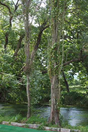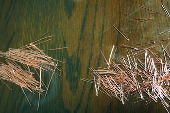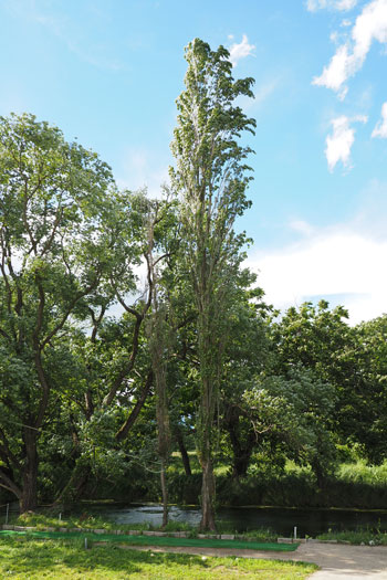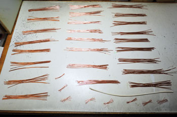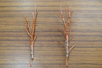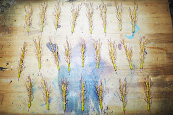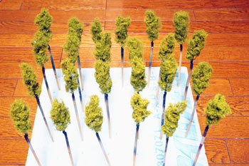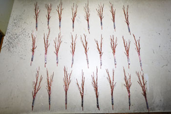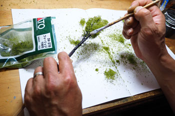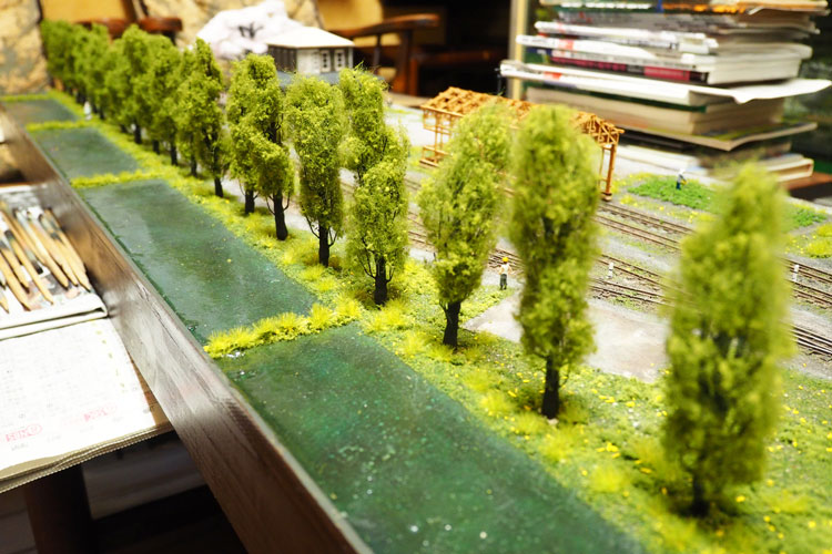 ![]() ボクが頸城の情景というと、まず思い浮かぶのが「爽やかなポプラ並木」です。 そのポプラの下にホジ3なんか置いたらイイだろ〜な〜、というのがこのレイアウトのひとつの目玉でしたので、気合いを入れて作ってみました(^^♪。 ただ、ざっと試算したところ25本ものポプラを作らないと、イメージ通りになりそうもないので、その点は憂鬱でしたが・・・(>_<)。 まずは、ネットでポプラの写真を集めてみましたが、やはり実際に見てみたくなり、「長野県・ポプラ」で検索したら、意外や意外、ウチからクルマで15分ぐらいの所にポプラ並木があることが判明(^O^)。 矢も盾もたまらずカメラを肩から下げてすっ飛んで行きました!(^^)! その場所とは観光地として有名な大王わさび農場というところで、そこに「ポプラ小径」というのがあるそうです。 そう云われてみればあったような気がしますが、今まではその気が無かったので、目にも止まらなかったのでしょうネ(^^ゞ。 ![]() ![]() しかし、その「ポプラ小径」に行ってみたら、御神木のようにぶっとい木ばかりで、ボクのイメージには合いませんでした(^-^;;。 気落ちして歩いていたら、意外にも並木ではありませんが単体でポプラの木を発見!しかも、これこそボクのイメージ通りのスタイルをしています\(^O^)/。 枝振りはひたすら「上へ上へ」延びていて、同じ広葉樹ながら桜の木とは全く違うもの。 このイメージを頭に叩き込んで、帰宅後さっそく作り出しました。 ![]() 幹の素材は桜と同じ銅線ですが、長さは10cmにカットして、スラッとしたスタイルを強調するために10本を束ねてみました。 その根元は2本だけ長く伸ばしておき、作業をする際の握り手としておきます。また、この部分は地面に植えるときの杭の役も果たします。 ![]() 桜と同様に根元の部分を銅線で縛って半田を流した所です。まあ、ここまでは勢いで出来るのですが、この後の枝ぶりを作っていく段階になって、いささか25本というのは根気の要る作業でした~(>_<。)~ ![]() 上の写真を見ると判りますが、幹の太さに対して異様に細い枝が出ているのがポプラの特徴のようですから、これを作らないといけません。 そのために0.55mmという細い銅線を買ってきて、5cmの長さにカット、更にV字状に折って枝としました。 これがポプラ1本につき12本。つまり小枝を300本(>_<)。 ![]() その小枝を幹に半田付けしていこうというのですから、もう我ながらアッパレというか、気が遠くなるというか、単純作業が苦手の男がよくもまあやったものです(^O^)。 もうチョット愚痴らせて下さい(^^ゞ。例の光硬化パテをチマチマと盛りつける作業も12本分。考えてみたら、このポプラの製作だけで昼夜兼行で丸々1週間も掛かってしまいました・・・。 ![]() これがパテで盛り付けた幹と、焦げ茶色に塗装した状態です。この後、ライトグレーでお化粧をしておきます。これらは根っこ部分の握り手を割り箸にテープで巻き付けての作業としました。 ![]() 葉っぱは定番中の定番「ウッドランドシーニック製フォーリッジ」を木工ボンドで固着していきます。ただ、今回は出来るだけスカスカにして、爽やかな風が吹き抜けるような感じにしてみました(^^♪。 ようやくの事で25本出来上がった晩の記念写真(^v^)。 ![]() 出来上がってみると植えてみたくなるのが人情で、地面に穴を明けて植えてみました。 隣りとの間隔を策定しながら植えてみたら、20本でちょうど良い感じになりましたが、これらは地面に固着してしまうと撮影の邪魔になる事が予想されるので、差し込んでおくだけにしておきました。 でも、この感じが欲しかったイメージなんですよね〜。バンザ〜イ\(^O^)/。 |
