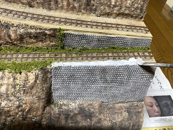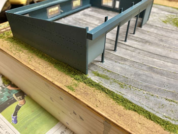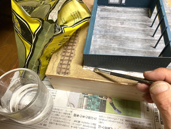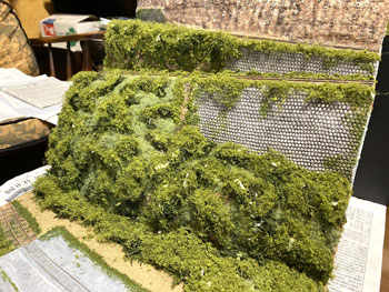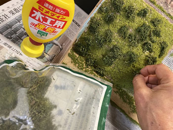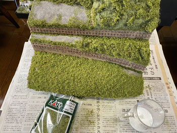 ![]() この作業はボクの定番の手法なので何ら新しいものはありませんが、一応おさらいをしておきます(^^♪。。 まずターフを場所に応じて木工ボンドの原液または水溶液で撒いていき、更にコースターフを撒きます。 ![]() これが機関庫の周りに撒いた状態ですが、まだ雑然とした感じが足りませんネ(^^ゞ。 ![]() 次は山の方に移り、まずは線路脇から作業を始めます。 そのあと斜面にも同様にターフ&コースターフを撒いてから、ライケンを木工ボンドの原液で付けていきます。 ![]() ライケンを付けた間にはスタティック・グラスを撒いていきます。 そしてフォーリッジをライケンの上に接着してやりますが、ライケンのフワフワした材質が効果的に灌木の厚みを出してくれます。 また、斜面に垂れ下がった雑草を表現するにもフォーリッジは効果的です。 ![]() 左の写真が完成した状態です。 次は一番上の斜面に掛かりますが、このような小さなレイアウトだとひっくり返して作業が出来るので楽です(^_-)-☆。 ここでも全く同じ作業を繰り返します。 ![]() これが完成した状態です。車輛を置いてみて感じを確認してみます。 ![]() さらにミニネーチャーの雑草を所々に植えて、雑然とした感じを出してみます。 |