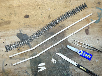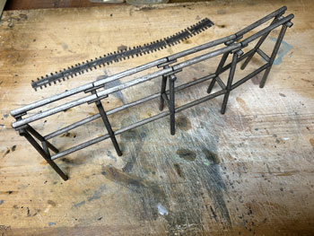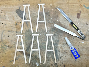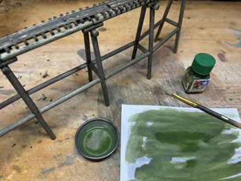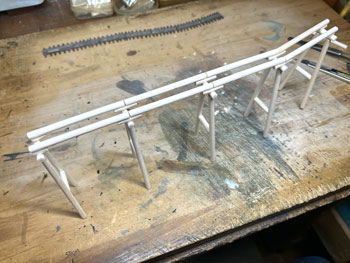 5月5日 ![]() 思い立ったが吉日な性格なもので(^O^)、5日の11AMごろ、何やら急に情景が創りたくなり、手元にあった31x21cmのパネル(小さいと制作時間も短くて済む)を利用して、在り合わせのスタイロフォームを重ねて創り始めてしまいました(^^♪。 一応、助六線の奥地のような情景で、線路の路盤は木橋のみというイメージなのですが、果たしてどうなるでしょうか?(^O^)? この季節とはいえ、木工ボンドで接着したスタイロフォームを彫刻できるようになるまでは時間が掛かるでしょうから、その時間を利用してこれから木橋を作ることにします(^_-)-☆。 ![]() 接着したウレタンフォームが固まる時間を利用して線路を作っておきました(^^♪。 レールはコード40の細いものを使い、適当な処にΦ1.0線を半田付けして軌間9mmをキープすると共に微妙なカーブ(わざとらしい(^O^))も保つようにしてみました。 これで梯子状になったので、両側に出っ張った不要な部分をニッパーでカットしてフラットアースで塗装。 これが乾いたらレールの裏側に大量に作ってあった2mm厚バルサから切り出して黒く染めておいた枕木を木工用瞬間接着剤で固定していきます。 ![]() 更にレールの間には1mm厚バルサを3mm幅にカット、長さを3600÷87=40mmにカットした歩み板を接着して黒く染めておきました。 こうすると最初に半田付けしたΦ1.0線は全く隠れてしまいます(*^^)v。 ここまでくると結構シッカリしたものになります。 さてと、線路が出来上がったので、これを支える木橋を作るとしましょう(^_-)-☆。 素材はΦ5mmのバルサ丸棒を使ってみました。 まず枕木の下の垂木を切り出して、その継ぎ目に丸の一辺を少しカットしたものを同じ方向に接着。 ![]() ![]() これを乾かしている間に柱を100mmにカットしたもので鳥居状に組み立てておき、上部は垂木の間隔をキープするための寸法出しと密着度を高めるために切れ込みを入れておきます。 そして鳥居状の柱と垂木を接着してから、補強材を現物合わせでカットして接着。 ![]() これらが完全に固まったのを確認したら、フラットブラックの溶液で染めるように乾かしては塗る作業を何度も繰り返していきます。 そして最後に枕木が付いている線路を接着して完成です(^^♪。 ![]() 仕上げにフラットグリーンを薄く溶いたものを適当に塗りこんで、苔が生えたような感じにしておきました。 ここでついナルってみたくなり記念撮影(^O^)。 |