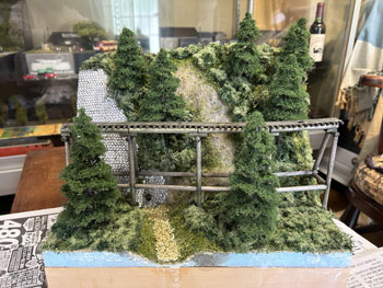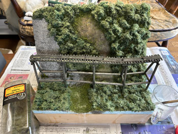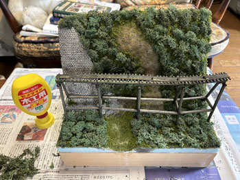 5月7日 ![]() 前日にコースターフを撒いて木工ボンドの水溶液で固定しておいたのですが、今日からは連休も明けて仕事の開始なので、夜になって作業を再開。 超ワンパターンの技法で、ライケンを木工ボンドの原液で適当に付けていくのですが、意外と使える部分というのは少なくて、枝みたいになってる部分は除去しながら小さく千切っておきます。 ![]() これがまだ乾かないうちで良いので、その上に木工ボンドの水溶液を筆で塗りながらスタティックグラスをパラパラと振り掛けていきます。 ![]() やはり木曽の情景ですから桧が欲しいところ。 針葉樹というのは広葉樹より何倍も雰囲気を出すのが難しくて、やたらオモチャっぽくなりがちです。 どうやって作ろうかな〜と散々悩んだ末に、Nゲージ用のトミー製の「杉の木」の幹+枝を使ってみる事にしました。 但し、付属している極彩色のスポンジは捨てて、暗緑色のフォーリッジを使って。 なお、枝の一番下は枝打ちをしておき、少しでも「らしく」してみて、そこはフラットブラウンにフラットブラックを混ぜたもので塗っておきました。。 ![]() この技法は初めての経験なので、まずは1本試しに作ってみたところ、なかなかイイ感じになり満足(*^^)v。 この感じであと6本作ってみました(^^♪。 5月8日 ![]() 翌朝になって出来上がった木曽桧は余分な糸くずをハサミで剪定してから、いよいよ植樹祭(^_-)-☆。 仮に手で持って「ここいら辺かな?」と探りを入れてから、思い切って太いドリルで地面の穴掘り。 めでたく7本全部の植樹を終えて、思わずまたナルった撮影を(^^♪。 う〜ん、イメージ通りの雰囲気に仕上がりました(*^^)v。 |