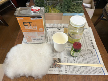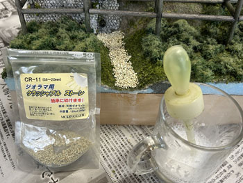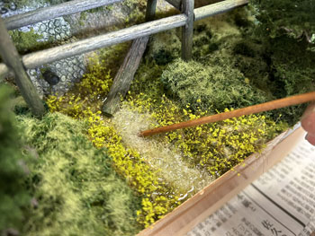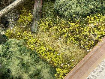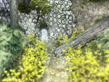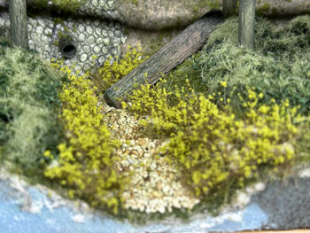 5月8日 ![]() さて、最後に残ったのは水抜きパイプから湧き出した清流の仕上げ。 この情景を入れることにより全体に対するアクセントになり、艶の無い情景の中に唯一の光沢のあるポイントになりますので、是非とも取り入れたかったものです。 最初に清流の底となる部分に細かい砂を撒いて木工ボンドの水溶液で固定しておきました。 次に「マーティン・ウェルバーグ」の雑草を小さく千切って水辺に接着しておきます。 ![]() さらに運材台車用材木の試作品があったので、それを1本使って土砂崩れで落ちてきた木が朽ちてきた感じにしてみました。 フラットグリーンを塗って少し苔むした感じにもしておきました。 これが固着したら、いよいよ水の流し込みですが、使う素材はいつもながらのメンバーです(^_-)。 ![]() まずレジンを注意深く流し込んでいきます。 このままでは水溜りになってしまいますので、いつものように熱帯魚の水槽用フィルターを小さく千切ってレジンの中に浸し、ニュアンスを付けながらザワザワした感じにしていきます。 ![]() 更にレジンを適宜追加しながらフィルターが具合よく水面にあまり出ないようにしていきます。 ここで放置プレイかな?と思ったのですが、水抜きパイプから出てくる水はフィルターを使い、しかもフィルターの上にレジンをまぶして光らせなきゃ、ということに気付きました(^O^)。 そこで、使い残しのレジンがまだ固まらないうちに作業をしておいた方が良い、ということになり、放置プレイは一旦中止(^^ゞ。 フィルターを少しだけ千切ってパイプに瞬間接着剤で固定してから、爪楊枝の先にレジンを塗ったものを擦り付けていきました。 これで一応完成ですが、レジンの流れ止めのガムテープを剥がしたら化粧板を貼る型紙を作って木工屋さんに頼みにいきましょう(^^♪。 5月5日の午前中にこの制作を思い付き、一日の仕事日を挟んでここまで丸3日間。 310X210mmという小さなものですから、まあ、こんなものでしょう(^O^)。 |