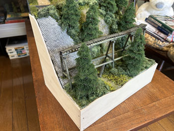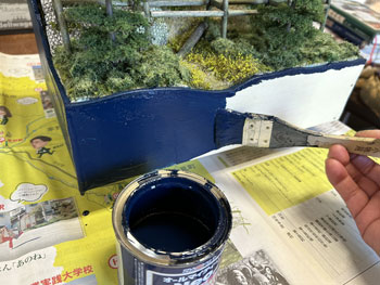 5月12日・15日・18日 ![]() ![]() 外周の型紙を新聞紙で作り、木工屋さんにベニヤ板のミシン加工をお願いして数日後に出来上がってきました(^^♪。 こういうことをする事によりスタイロフォームの不細工なものも見えなくなり、グッと作品っぽくなってきます(^_-)。 ![]() この化粧板を貼った木工ボンドも固まったようですのでナス紺に塗ってやり、最後の画竜点睛でモデルワーゲンのプレートを貼って完成! 竣工記念に数カット撮ったのですが、こうやって出来上がると、チマチマと型押ししていた石積みの苦労もぶっ飛びます(^O^)。 ![]() ![]() |