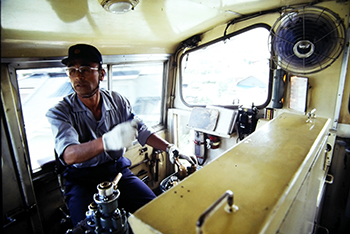 これは当然事前に申し込みをしておいたので、DLの運転室に添乗を許可され、盛駅から終点の赤崎駅まで2.0kmの往復を取材しました。