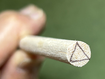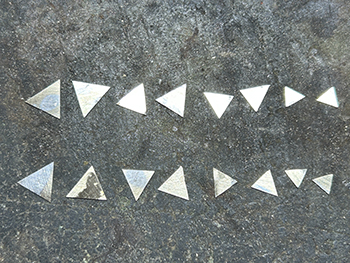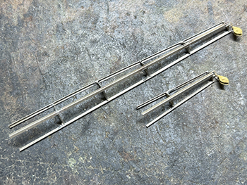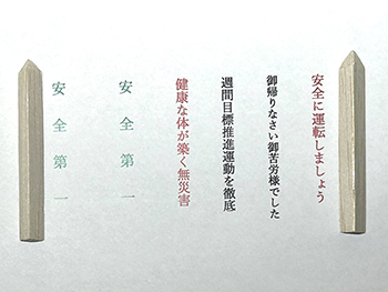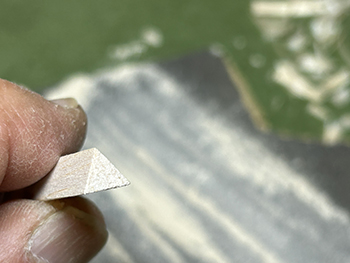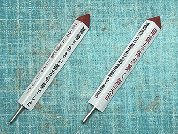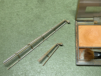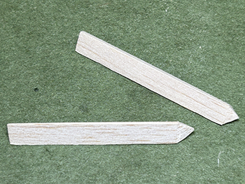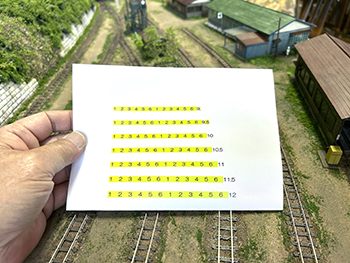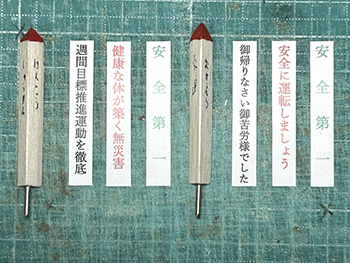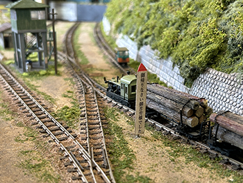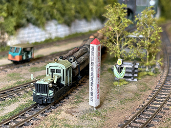 ![]() ![]() 「安全スローガン塔」とでも云いましょうか、司令塔の横とウグイ川線に行くトンネルの入口(というか出口というか)に建ってる三角柱をしたものです。 三角柱なんてどうやって作ろうかと考えて、松本製材の情景のときに買い込んだΦ8のバルサ棒から切り出す方法を考え出しました。 ザックリとカッターで削いでいき、粗目のサンドペーパーの上で注意深く正三角形になるように仕上げて、天辺を三角形に尖らせて。 ![]() ![]() ここからはパソコンの恩恵100%で、良い時代に生きてることに感謝。 スローガンのフレーズは様々な写真に写り込んでるものから打ち込みましたが、上下の寸法が殆ど同じになるように文字の大きさを変えたりしながら2回目のプリントで合格(^_-)-☆。 全体の高さがどうなるか分からないので少し長めに作っておいた三角柱ですが、これで天辺の三角部分を除いて42mmに決めてカットして、土に差す部分としてΦ1.5棒を打ち込んで接着。 天辺部分を赤く塗っておき、乾いてから木工ボンドでスローガンを貼りつけました。 ![]() ![]() 大鹿らしい光景は「司令塔」の他に「番線表示」があることでしょう。この黄色い札がケーブルにぶる下がっていて、「大鹿ヤード」らしさを出しています。 さて「番線表示の支柱」です。 色々と考えたのですが、最低限にして充分な効果がある方法を選び、正三角形の板とアングル材を組み合わせることにしました。 まず、t0.4の真鍮版を4枚貼り重ねて半田付けをして、正三角形の高さを7mm、6mm、5mm、4mmにケガいていき、それぞれ1.4を掛けた数値を底辺にしてケガキ。 それを糸ノコで切り抜いてから暖めて4枚をバラバラに。更に各々2枚の高さを6.5mm、5.5mm、4.5mm、3.5mmにヤスっていきました。 そこに1.0x1.0mmのアングルを半田付け。結果的には正三角形はこんなに必要なかった訳ですが、ま、保険ということで(^O^)。 最後に天辺の板にテスリ状のものをΦ0.3で作って、そこに「集材セット」に入っている滑車を半田付け。 ![]() MWプライマーで下塗りをしてから銀色に塗り、ウェザリングマスターで少し錆が浮いた感じに(^-^)。 そして地面に固定しました。 ![]() 一方、「番線表示板」はパソコンで数種類大きさを打ち出して現場に持っていき、どの大きさのが良いかを検討し、いつもロープ掛けに使っている絹糸を張って瞬間接着剤で固定。 そこに「番線表示板」を貼り付け記念撮影(^^♪。ここまで来ると、完成まで秒読み段階になります(*^^)v。 |