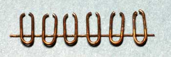 仕組みは至って簡単。Φ0.4真鍮線を長円形に曲げて、根元から1mmの部分に燐青銅線を半田付けしたものだそうです。写真下の部分がピンによって朝顔カプラーに固定され、先端の割りが入った部分が、相手方の朝顔に差しておいたピンにパチンと嵌まる仕組みです。試しに運転会で何回もパチンパチンと抜き差ししてみましたが、ルーズになることもなく、しかもこのとき持参された10tボギーDLがE型貨車+大型B客3輌+小型モーターカーを牽いても(総てにこのカプラーを装着済み)列車の重みに耐えかねて開放することもなく、推進でも全く問題はありませんでした。
