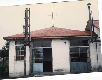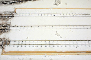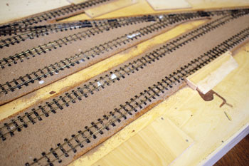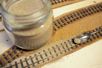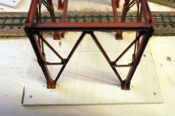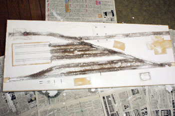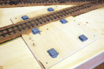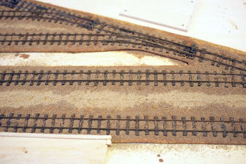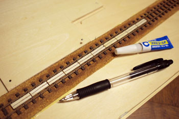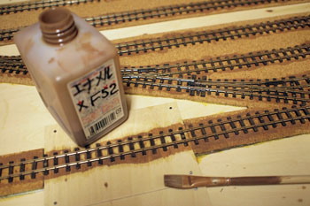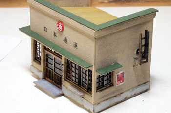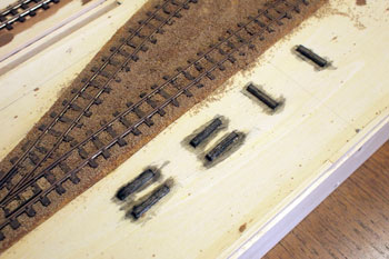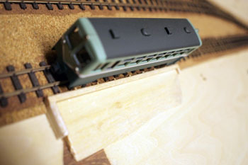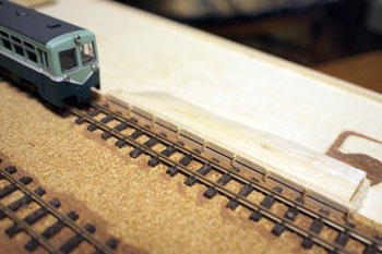 レイアウト作りというのは勢いが大事で、間が空いてしまうと何となく乗りが悪くなってしまい、最悪の場合は途中で挫折してしまうものです。 自分で云うのもナニですが、梁ケ瀬森林鉄道のレイアウトなんていうのはそれで、チョットした事情で間が空いてしまい、そのまま休止状態(やめた訳ではありませぬ)に陥ってしまいました(^-^;;。皆さんも同じような経験がおありなのではないでしょうか? 特にレールを敷き終わった状態というのが第一関門で、今回のようなモジュールでしたらまだしも、エンドレスが組み込んであるレイアウトなんかだと、試運転と称して走らせる事に興じてしまい、ついそこでストップしてしまいがちです。 ということで、レイアウト作りは勢いが大事、という事を肝に銘じておきましょう(^^♪。 11月1日 ![]() さて、大工仕事が終わったら、まずやることはレールと枕木の塗装です。少し薄く溶いたフラットアース(決してシャバシャバではなく、そこそこに粘土のある状態です)を太目の筆で塗っていきます。 通路になる部分には2mm厚のバルサ板を貼っておきますが、長さは1間、つまり21mmにカットしておきます。貼り付けが済んだら真ん中あたりをボールペンで凹ませます。 エッ?ボールペンなんかでイイの?と思われるでしょうが、板自体は塗るというよりも染める感じにするので、却って凹んだ部分が黒くなって感じがイイのです^\^)。 ![]() プラットホームをこの段階で作っておきます。三方の囲いの素材は3mm厚バルサ材で高さは8mm。中ほどをボールペンで凹ませておきます。1mm角の桧材をチョンチョンと貼り付けて支えとし、囲いの中にはテーパー状にした6mm厚のバルサ材を接着します。 レールとの距離は現物合わせで決めますが、直線部分ですから結構近づける事が出来るはずです。 レール&枕木の塗装が乾くのを待つため今日の作業はこれでオシマイ。 11月2日 ![]() 翌朝起きたら塗料も完全に乾いていたので、バラストを撒く事にします。 バラストはKATO製(つまりNゲージ用)で淡黄色細目という品です。粒の大きさはベストで、これをNゲージに使ったら大き過ぎるだろうな、と思います(^O^)。 写真のようにスプーンを使って撒いていきますが、このスプーンはバラスト撒き専用に加工したもので、万力で幅を細くしてあります(^^♪。 撒いては筆でならして枕木の上にバラストが乗らないようにしておきます。多少は乗ってしまいますが、それは固着後に剥がしますので、あまり神経質にならなくても良いでしょう。 水に中性洗剤をチョイと垂らしたものを霧吹きで撒いてバラストを湿らせ、さらに木工ボンドをぬるま湯で溶いたものに中性洗剤をチョイと垂らしたものをスポイトで垂らして固着します。 これの乾燥は結構時間が掛かりますので、その間に建物の工作をしましょう。 ![]() 今回のモジュールでの建物は車両庫・詰所x2・積替施設・雪印の集乳所・日通事務所です。 前に書いたように、積替施設は畑中さんから頂いたものを使うので、まずはキットが使える日通事務所から作り始めました。クラシックストーリーの製品です。 ターンテーブルもそうですが、このキットも素晴らしい製品で気持ちよく組み立てる事が出来ました。 ただ、そのままでは能がないし、北海道らしくないので、煙突を付けてみることにしました。 内地の場合ですと煙突があっても単純に壁から立ち上がっているだけなのですが、北海道のそれには補強用の枠が付きます。 写真は標茶で平田邦彦さんが撮影されたものですが、イメージがお判り頂けるのではないでしょうか? 左側の枠は地面から立ち上がっていますが(しかも煙突は何と土管を継ぎ足したモノ!)、右側の枠は屋根の部分から立ち上がっています。その気になって他の写真も仔細に見ていくと結構バリエーションがあるようで、これという定番はないようです。 煙突自体はφ1.5棒とφ1.5パイプを半田付けしたもので、壁の穴塞ぎは3mm角にカットしたプラ板で作りました。 11月3日 ![]() さて、バラストもカチコチに乾いたようですので着色します。また例によってフラットアースの薄めたもの(これはレールを塗ったときよりも薄く溶いたもの)です。 ポイントはバラストで固着されてしまってるかも知れないので、切り替えてみてチェックしておきます。また今回着色する事によって固着する可能性もありますから、こまめにチェックしておきましょう。 プラットホームの枠は薄く溶いた黒で塗っておきます。 ![]() これまた乾くのに時間が掛かりますので、他の作業を済ませておきます。 積替施設を頂いた状態ではミニシーンに固定されていたので、それを外す時にバルサ材で出来たコンクリの土台が壊れてしまいました。 まあ、このようなものは簡単に作れますから良いのですが。3mm厚のバルサ材を10mm角にカットしたものを土台にするので、施設をボードに置いてその位置を鉛筆でマークしておきます。 それを目印に土台を接着してグレーに塗って