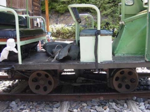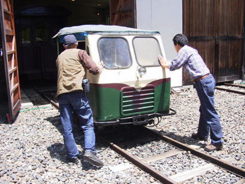 ![]() 赤沢の駐車場で迎えてくれた昴さん御夫妻。聞けば習志野を夜中に出発して、木曽入りは早朝だったので、滝越や三岳などで時間を潰していたそうな。昴さん御本人はイイけど、奥様はイイのかなア?ま、とにかく、今日の目的のひとつは「モーターカー」の採寸です。もうお判りですよネ。そうです。頒布会の第4回配布製品の設計のためのデータ集めです。大まかには採寸してあったのですが、改めてチャンと計ろうという訳です。もりこーと蜜澤さんは息の合った作業で、次々とデータを集めていきました。