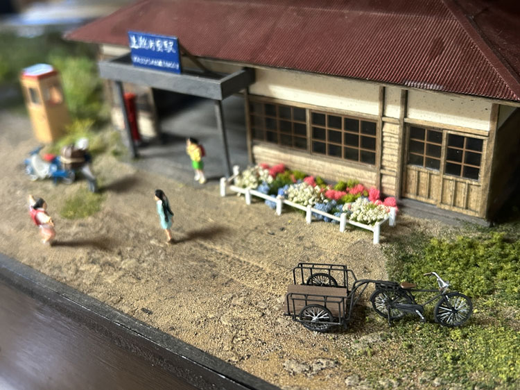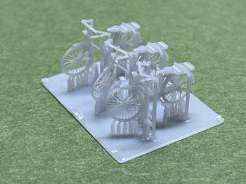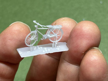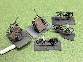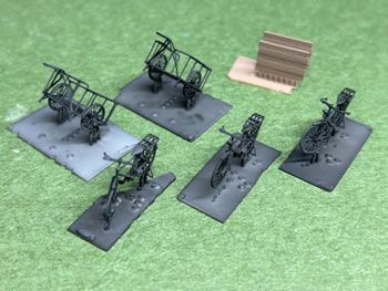 自転車&リヤカー ![]() 製造担当のKinoArtsの加藤さんから塗装に関するアドバイスを頂いたので、実際にボクも塗装をしてみて、ここで解説してみようと思います(^^♪。 要点は下記の通りです。 *この素材はプラモデルと違いラッカーシンナーに侵されないので、ラッカーで塗ることも可能。 *ミッチャクロン、もしくはスーパーマルチプライマーなどのプライマーで下塗りをする。 *但し、車両と違って塗り上がってしまえばそうそう触るものではないので省略しても構わない。 *既に洗浄をしっかり行っているので、製品を塗装する前に中性洗剤などで洗う必要はない。 これを踏まえて、ボクは下処理をせずに先ずタミヤのアクリル塗料で塗ってみました。 メッキ部分などはこの上からエナメル系で筆塗りをすれば良いと思っています。 1.塗装をする前にランナーを除去する必要があり、その作業をしやすくするために、ベースごと1台ずつハサミで切り離しました。 そして枝葉の部分から良く切れるカッターや細密ニッパーで丁寧にランナーを除去。 塗装の便を考えて最低限のランナーだけは残してやりました。 ![]() 2.云ってしまえばこの製品でこのランナーを除去するのが一番神経を使う部分です。 そして専用シンナーで薄めたフラットブラックをエアーブラシで塗装。 リヤカーの底板だけはウェザリングを前提にフラットアースを塗りました。 ![]() 3.ベース板に付けたままサドルはエナメル系のレッドブラウンで、ハンドルの握る部分はフラットアースで、メッキ部分はクロームシルバーで筆塗りしました。 筆塗りには自分の持ってる一番細くてコンディションの良いもの(^O^)を使い、ネットで実物の写真を検索して何処がメッキされた部品なのかを調べておくと良いでしょう。 乾燥したらウェザリングマスターで軽くウェザリングをして、最後にベース板から切り離して完成です(*^^)v。 実は自転車で1台、ランナーから切り離す際に右側のペダル部分を折ってしまい、「これはそっちを見せないようにすれば使えるな」と思い塗装は進めて、倒れた自転車として活用しました(^O^)。 皆さんも同様になっても落ち込まないように(^^♪。 ![]() ![]() ![]() 何と早くもお得意様がこのような写真を送ってきて下さいました(^^♪。早い!!! |