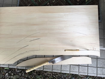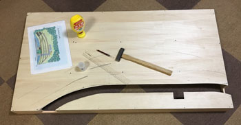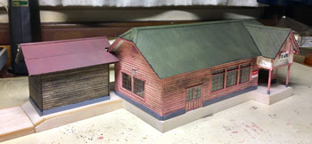 ![]() 駅舎が出来上がらないと、これをパネルのどの位置に配置したら良いのかが判りませんので、先行して作りましたが、駅舎が出来上がったところで3次元としての大きさも目で把握できるようになり、いよいよレイアウトパネルを作る事にしました。 尾小屋駅というのは大袈裟に言えば谷底のような処にあり、駅前は坂道になっています。まあ、これが特徴と云えば特徴なのですが、パネルの大きさを600mmとした関係上、そうはこの部分にスペースを割く事は出来ません。 じゃ、どこまで表現するか、というのが写真での上下方向の位置決めなのですが、そもそもこのレイアウトは撮影の為に製作するもので、作品ではありませんから、その撮影を妨げるような要素、つまり、駅前の谷上から眺めた時に駅構内を水平に撮れないなどの障害があるため、あっさりと坂道は表現しない事にしました。 ![]() 上下方向の位置が決まったら、今度は左右方向の位置決めです。 これは仮にレールを置いてみて決めたのですが、特に左側の2個ある機関庫を設ける関係上からポイントの位置が決まり、それによって駅舎を何処に置いたら良いかも決まりました。 計画では欲張って留置線を1本追加してみたのですが、それでは奥の山が表現できないので、実物通りに3本で行く事にもしました。 ホームセンターで4mm厚ベニヤ板と、60x9mm桧角材を設計寸法にカットさせて、いざ組立開始です。 ![]() 川の部分はノコギリでカットしていきますが、引き回しノコも部分的に使いました。 いま現地の川は改修工事がされたようで深くて広くなってしまいましたが、当時は小川程度のもので、幅は駅舎の短手方向の寸法より少し狭いだけで、深さもドブ川程度のものでした。 ![]() 駅前の対岸部は構内よりも少し高く表現したので、10mm厚バルサを間に入れて嵩上げしてやり、駅舎のエントランスを逃げる部分の切れ込みを入れておきます。 こうして釘と木工ボンドを使いながらパネルを作って行きました。 ![]() 上にも図面を出しましたが、この段階でホームを含む駅舎の土台を正確に寸法だしして図面にしておきます。 この部分の厚みは10mmに設定して、バルサ材から切り出しました。バルサは加工がしやすく軽いのでボクは多用しています。 かつては貨物ホームだった部分は低くなっていますので、ここは5mm厚のバルサ材を使用。共に縁石は2mm桧角材を掘り込んで接着しておきます。 仮に駅舎と物置を置いてみて、感じを掴んでおきます。 ![]() |