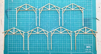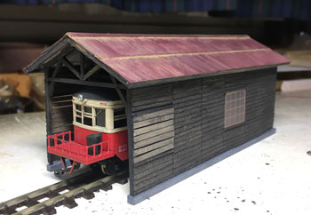 ![]() さて、次は大きな方です。こちらは窓があるので、小さい方よりも少し面倒ですが、基本的には同じ作り方です。 まず柱を切り出しますが、基本的に柱は1.5mm角の桧棒を使っています。 主柱は長さで切り出しますが、はすかいになってる支柱などは図面の上に角材を置いてカッターで切ります。 横柱と支柱を写真のように接着して、その後で縦柱と屋根裏柱を接着します。 ![]() 更に横柱の下の支柱を接着して柱は完成です(^^♪。 ここで一旦縦柱を外して図面の上にセロテープで止めて、下見板を接着していきます。窓の上下は1mm角材を貼ります。 ![]() 側板が完成したら、先ほど作っておいた柱と組み合わせます。 因みに、この機関庫の詳細はイマイチ判らない部分が多くて、窓の配置やその数などある程度は推測の部分もあります。 ![]() 突き当りは小さな機関庫と違って塞がっていますので、下見板を貼っておきます。 屋根板はボール紙の上に波板を貼って表現しましたが、四辺には1.5mm角を貼っています。 ![]() 裏返すとこのようになっています。柱なんて水平に見ない限り見えないところですが、どうせ作るなら本物チックに作りたいですからネ(^O^)。 左右側面の出入り口近くの窓は、板で塞いだような雰囲気にして変化を出してから、例によってエナメル系のフラットブラックを薄めたものを、染めるような感じで何回も塗り重ねて質感を出し、更に裾の部分はMWカラーのウェザリンググレーを軽く吹き付け、屋根は艦底色を塗ってからハンブロールの63番を薄く溶いたものでサビを表現しました(^_-)。 ![]() 土台はレイアウトパネルに接着して、その後の作業に備えます。 大小の機関庫が出来上がって車両を置いてみると、次第に雰囲気が出てきました(^_-)-☆。 |