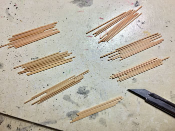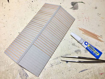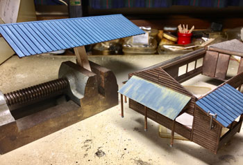 ![]() 当時の尾小屋駅構内の写真を見ると、製材所らしき建物が見えます。写真の片隅に(^^ゞ。 ボクもそうなのですが、こんな建物なんか写真に撮ってるはずがなくて、ネットで色々と調べても、良くて写真の片隅にチロっと写っている程度です。 だったら、いっそのことフリーで作ってしまえということで、設計をしてみました。 あと、本当だと、レイアウト上では右端の方に建っているはずなのですが、バランスを考えて左端に持ってきています。 基本的には床面積がそこそこあって、高さはさほどない、そんなイメージです。 機関庫と違って中を見せる訳ではないので、エコーモデルの下見板セットに入っているボール紙を使用して、下見板を貼っていきました。柱は1.5mm角の桧棒です。 ![]() 出入口は大きな吊り戸4枚にして、脇には事務室の出っ張りを設けて変化を出してみました。 ただ、この吊り戸を開いた状態にしてしまうと、中の機械類を何とかしなければならなくなり、これはエライ事になるので、チョットだけ開けて「朝の始業前」という時間設定にしてみました(^O^)。 ![]() 一旦は吊り戸を付けたのですが、ハタと閃いて、どうせだったら滑車とレールぐらいは作ろうと、φ0.5線と帯金でチョチョイと上下に表現してみました(^^♪。 奥と右奥には差し掛けを設けたので、これも作っておき、基礎部分は2mm角棒で表現しました。 ![]() 屋根は瓦葺棒として、駅舎と同じように作っていったのですが、1mm角棒をこれだけ切り出して接着していくのは忍耐との勝負(^O^)。どうもワンパターンの作業に弱いボクです・・・。 しかし、最近では木工用瞬間接着剤も、ホームセンターに行くと安いのが売ってるので、心おきなく使えるのが良いですネ(*^^)v。 ![]() 屋根も出来上がって製材所本体に接着。差し掛けにも波板を貼って、一応は体裁が整いました! イメージではこの差し掛けの下には、普段使わないような鉄板や、何かの時に切っておいた竹などを置いてみようと考えています。 ![]() 下見板は機関庫よりも色気を出したかったので、黒ではなく焦げ茶色の塗料を薄く溶いて、例によって何度も塗り重ねていきました。 片隅に写っている製材所のカラー写真を見ると、どうやら屋根は青っぽいようでしたし、レイアウト全体を見た時に、青い屋根というのは視覚的にポイントになると思い、このような色に塗ってみました。 画竜点睛は看板の設置。この「マルカ製材」というのは勿論架空の会社ですが、製材した木材に「〇の中にカ」というハンコが押されている、そんなイメージです(^_-)。 それに、誰が見ても「あ、これは製材所なんだな」って思って貰えるでしょ(*^^)v。 窓枠はエコーモデルのものを使用して、雨風に濡れて汚れて、手入れを殆どしていない感じでウェザリングをしてみました。 中がガランドウなのが見えても困りますしネ(^^ゞ。 ![]() さて、製材所が出来上がったところで用地の確保です。 上にも書きましたが、左側に置く事は決めていたのですが、裏山と機関庫との関連から、ようやくこの位置に決めて、基礎をレイアウトパネルに接着してグレーに塗っておきました。 製材所の建物1個だけでは寂しいので、木工所も作ってみようと思い立ち、それの設計を始めましたが、その話は次回で。 |