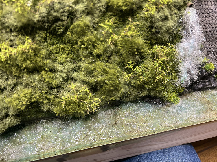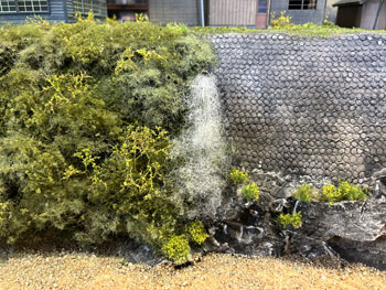 ![]() ![]() さてさて、いよいよこの情景も残すところ魚梁瀬川に水を流す作業のみ。 台枠を作り始めたのが12月5日でしたから、途中、製品に使う部品の袋詰めなどがあって休んだ日もありましたから、ここまでで約1か月というところでしょう。 線路を横切って水路を作ったので、崖にはその排水管があります。 当然のことながら流れる水を表現しなければならない(というか、それをやりたかった)ので、ほとばしる水を表現します。 この工作は加増田鉱山のレイアウトでもやったのである程度は勘が掴めています。 まず、濡れた崖の感じを出すためにクリヤーを塗っておきました。 そして、釣り糸を適当な長さにカットしたものを束ねて、木工用瞬間接着剤で固めたものを先ず排水口に接着。そのあとで千切った熱帯魚の水槽用のフィルターを接着。 そしてこのフィルターにレジンを塗りつけて水滴を光らせるのですが、これは川にレジンを流し込む時に一緒にやりますから、今の段階ではここまで(^_-)。 ![]() 川の部分にレジンを流し込むので、周囲にガムテープを貼っておきます。 レジンというのは考えられないぐらいに浸透力があるので、何度やっても何処かから漏れてしまうものですが、ある程度は諦めています。 ![]() ![]() 竹串を使って排水部分にレジンを塗ってみたり、例によって生きた水にするために、家伝の秘方(^O^)、熱帯魚の水槽用のフィルターを千切って竹串で押し込むように埋め込んでいきます。 埋め込みの感じも所々白波が立ったようにしたり、変化を出すようにしていきます。 水圧によりガムテープを貼った部分が膨らんできたので、慌ててベニヤ板を打ち付けてみたりしながら、完全に硬化するには24時間ほど掛かりますので、どうしても何処かからレジンは漏れてきてしまいます。 ![]() それでも何とか出来上がったときの嬉しさは格別で、つい自画自賛してみたくもなります(^_-)。 |