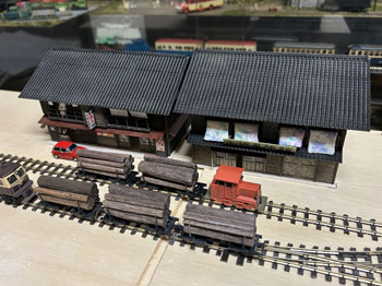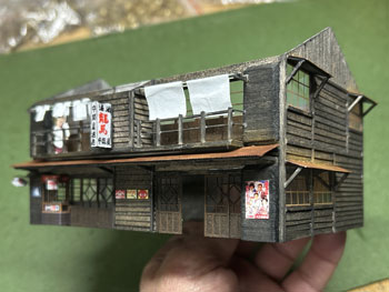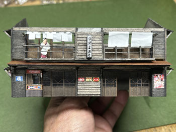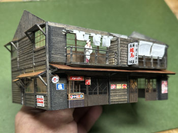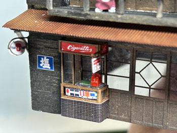 ![]() ![]() やはり酒屋は必要でしょう!ということで、酒屋を作ってみました(^_-)。 これも高知県らしさを出そうと酒屋の名前は「中岡屋酒店」にして、看板には「清酒 龍馬」(^_-)-☆。 二階の物干し台には黒渕ジャンクションの時に採寸したデータを使って洗濯物を干してみました(^^♪。 ![]() ![]() お店の片隅に「M's factory」のタバコ売り場をセットして変化を出し、手持ちのポスターを色々と貼って賑やかな感じに(^_-)。 ![]() そして屋根を作って乗せて完成。 僅かに宿屋とは大きさを変えたり高さを変えたりしたので、似たような二階家でも、こうして並べると変化があって良い感じになりました(^_-)-☆。 |